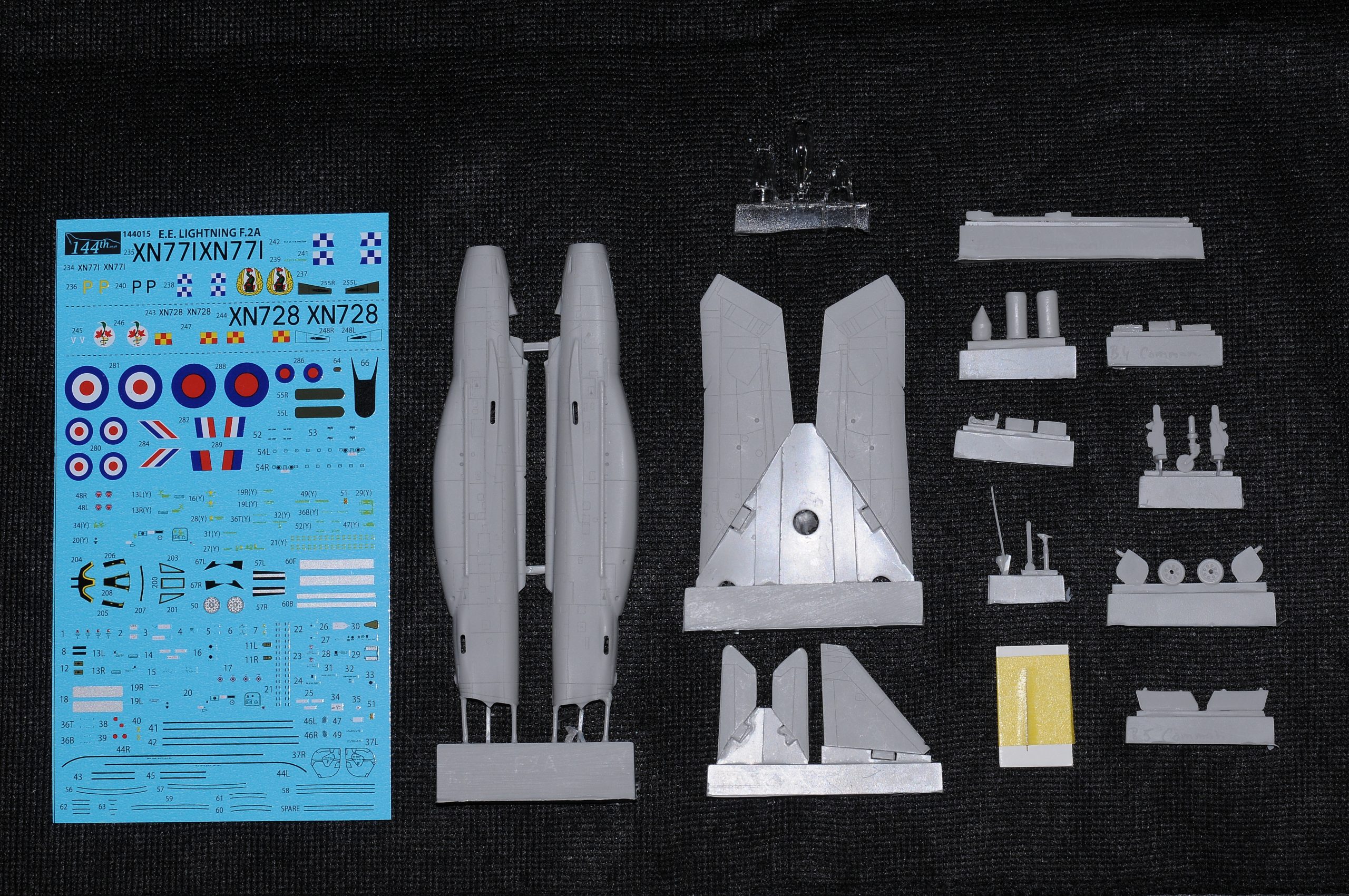 Kit consists of 29 resin parts. 3 part clear resin canopy (one piece closed, two pieces open), plus a brass turned pitot tube.