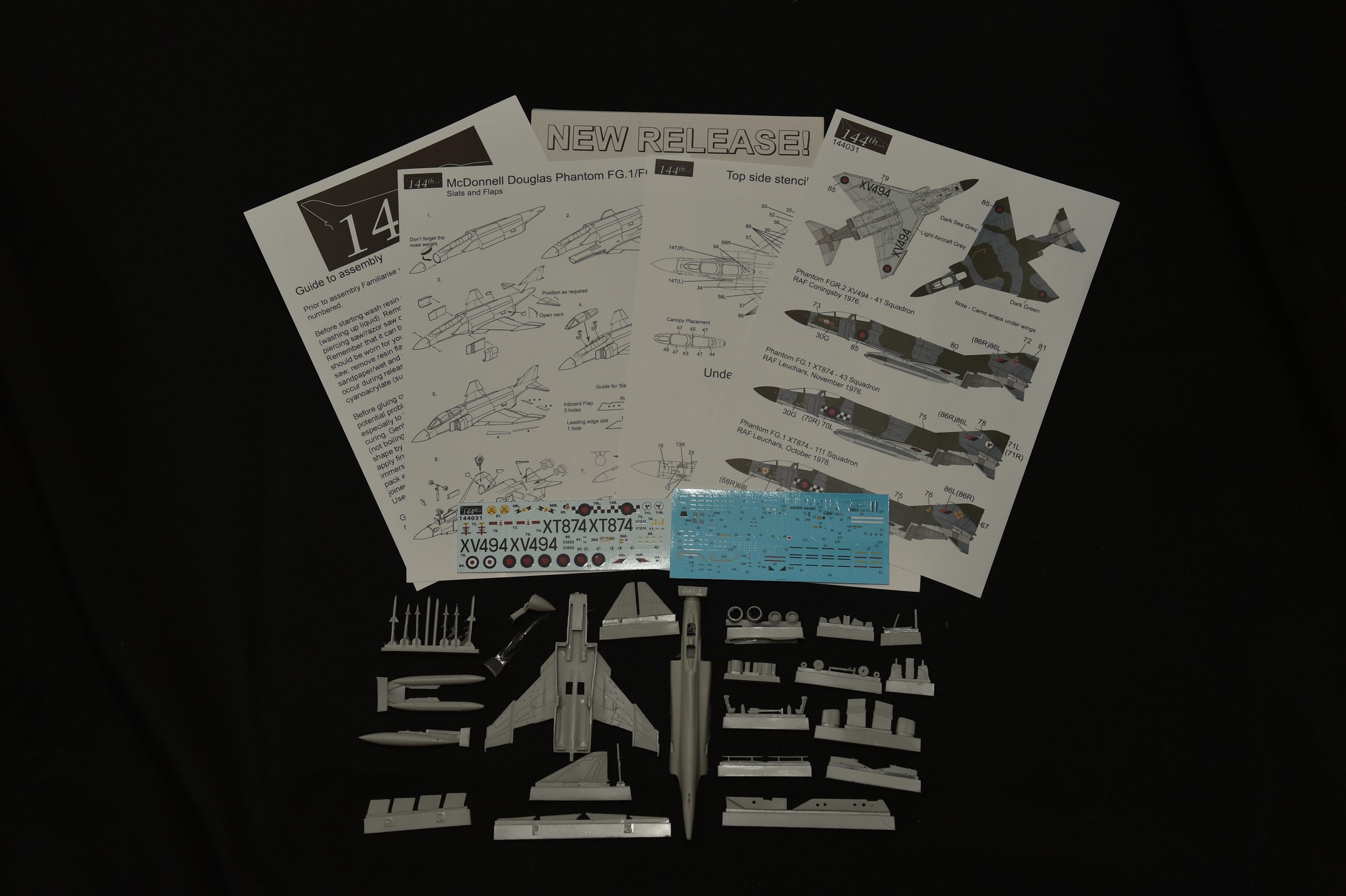The decal sheet gives the modeller a choice of three Royal Air Force squadron markings, 41, 43 & 111 Squadrons, plus a combination marked 111 & 43 Squadron. XT874 111 squadron based at Leuchars was zapped by No 43 squadron applying checks to port and starboard sides. The Fighting Cock ( Comic rooster ) ident 69 was port side only. See colour profile sheet. Applying the numerous maintenance/data markings see the enclosed stencil placement sheet.